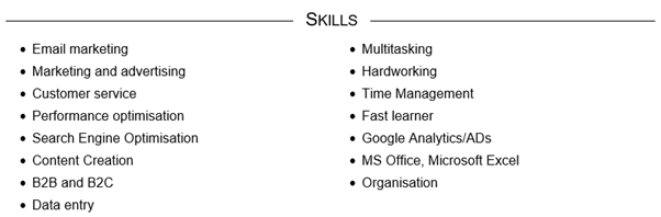 “Pro-active, passionate, detail-oriented graduate with strong IT skills and a broad understanding of business channels, market research and consumers. Industry and internship experience, created successful business campaigns, monitored success and adapted strategies.