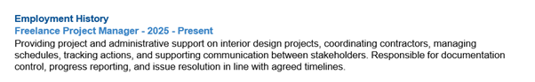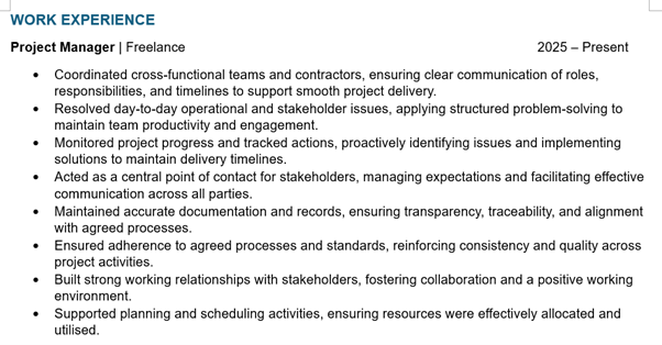 “Proactive, adaptable, and detail-oriented Project Manager with strong organisational, communication, and strategic thinking skills. Experienced in planning, assessing, and reviewing work to ensure objectives have been achieved, as well as working as an effective member of cross-functional teams in fast-paced environments. Certified in the APM Project Fundamentals Qualification (PFQ), PRINCE2 Foundation & Practitioner, and AgilePM Foundation and Practitioner, bringing a passion to deliver successful project outcomes. Currently seeking the opportunity to positively contribute to a creative, progressive organisation that values continuous improvement and quality.”