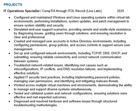 Many IT candidates include lab work gained from their studies through ITOL Recruit or technical projects. Data Analysis candidates can reference personal analysis projects, and HR candidates may be inclined to highlight volunteering or people-focused work.