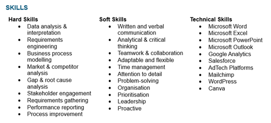 “A detail-oriented, analytical, and proactive professional with experience across digital marketing, advertising operations, and customer-focused environments. Characterised as a collaborative and solutions-focused team player, with skills ranging from data analysis and performance reporting to stakeholder communication and process improvement. Certified in the BCS International Diploma in Business Analysis, an ideal candidate for a new, challenging role within business analysis or data-driven environments. Eager to contribute skills and experience to a progressive organisation that values continuous improvement, innovation, and data-informed decision-making.”
