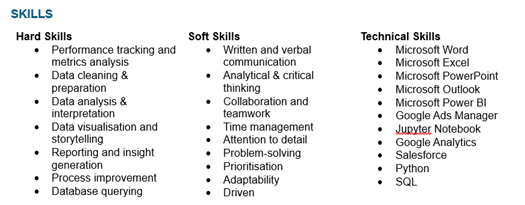 The key principle is that your skills section should reflect what employers are searching for – not just what you’ve done. A good way to assess this is by thinking about what kinds of skills you see most often in the roles you are applying for, and whether you can confidently demonstrate that skill on your CV (and, more importantly, in an interview).