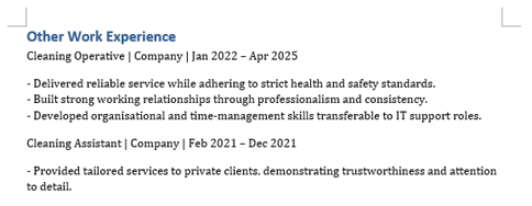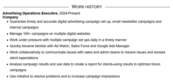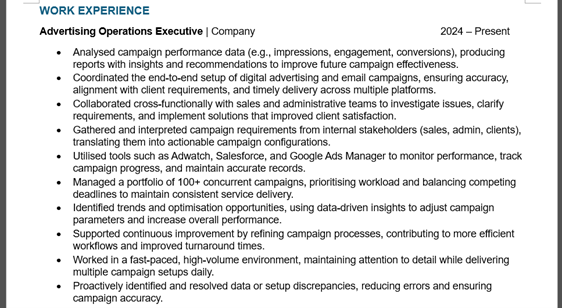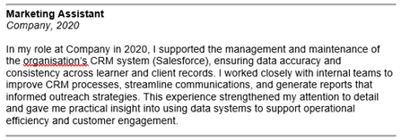 Now, let’s take a look at a CV for a previous Data Analysis graduate. Their Work Experience section reads as follows: